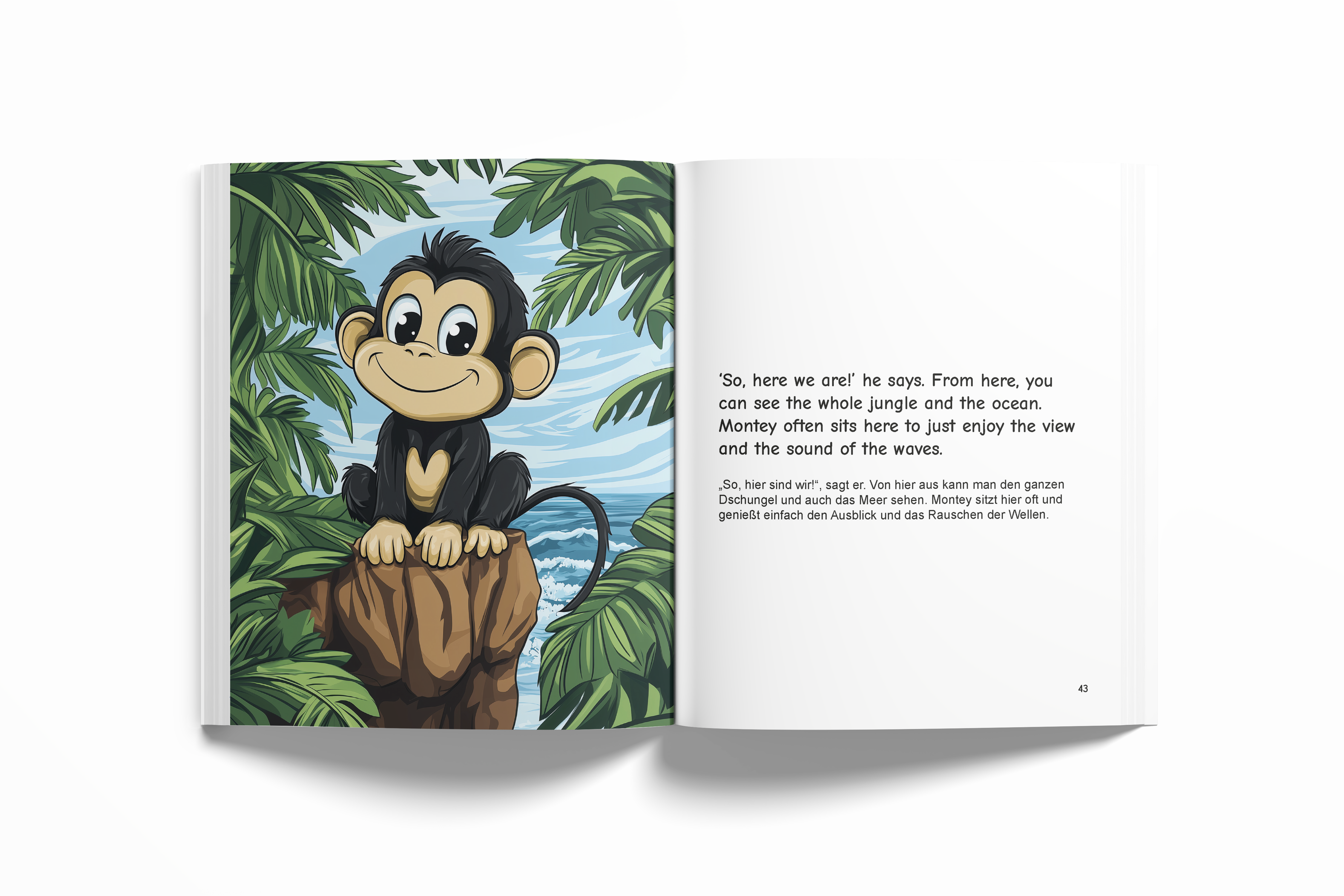 Unsere zweisprachige Geschichte ist speziell für Kinder im Alter von 6-8 Jahren konzipiert. Mit einfachen Sätzen und farbenfrohen Bildern ist dieses Buch der perfekte Begleiter für das frühe Englischlernen. Monteys Abenteuer sind realitätsnah und bieten authentische Alltagssituationen, die Kinder spielerisch in die englische Sprache einführen.
